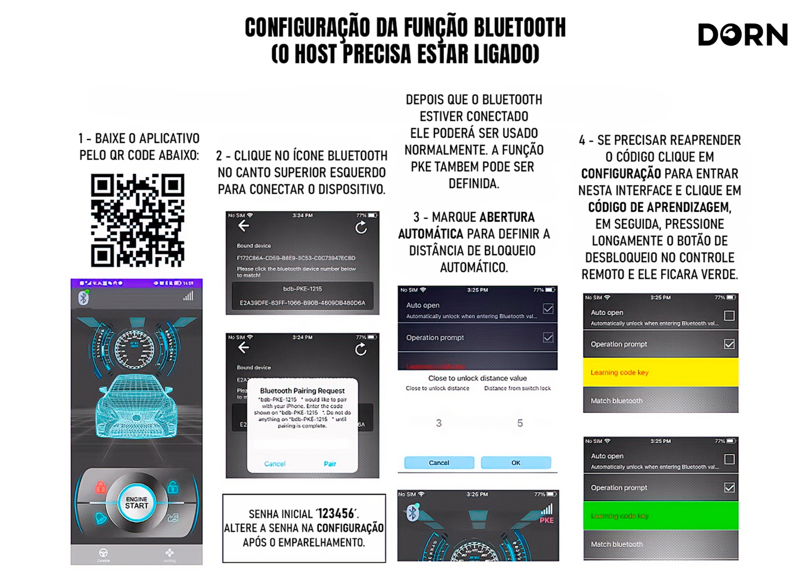 - Bluetooth Coding / Matching Remote Serve para parear novos controles físicos através do App. Clique na opção, confirme e segure o botão DESTRAVAR do novo controle por 10s.
